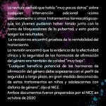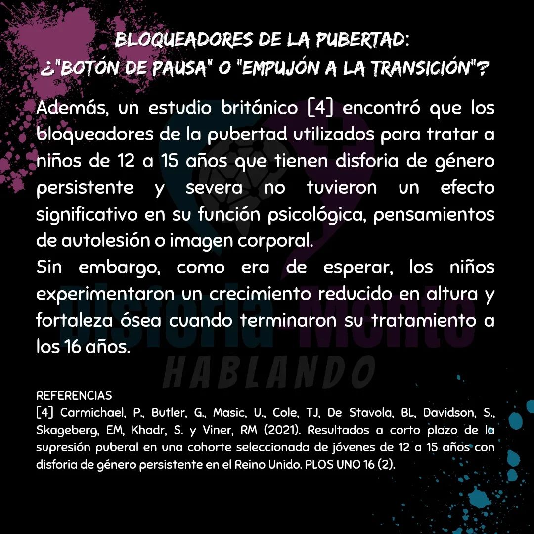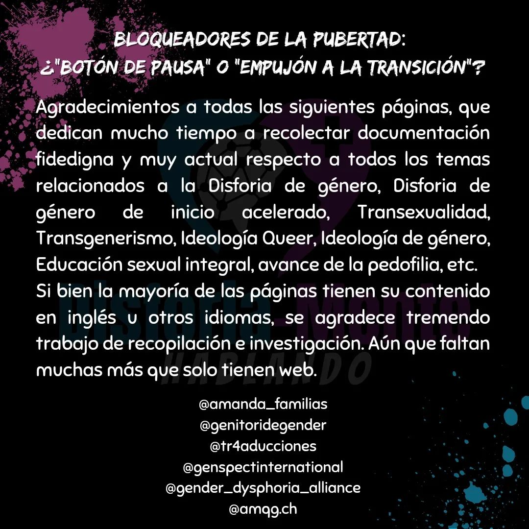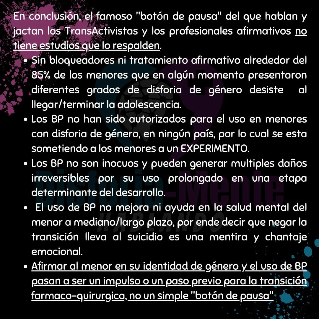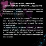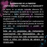 Lo que se advierte por mi parte y otra mucha gente que estamos silenciados sobre los bloqueadores de la pubertad, es la falta de información real y un tratamiento efectivo antes de tener que usar medicamentos o cirugías con efectos irreversibles sobre la salud y el cuerpo.