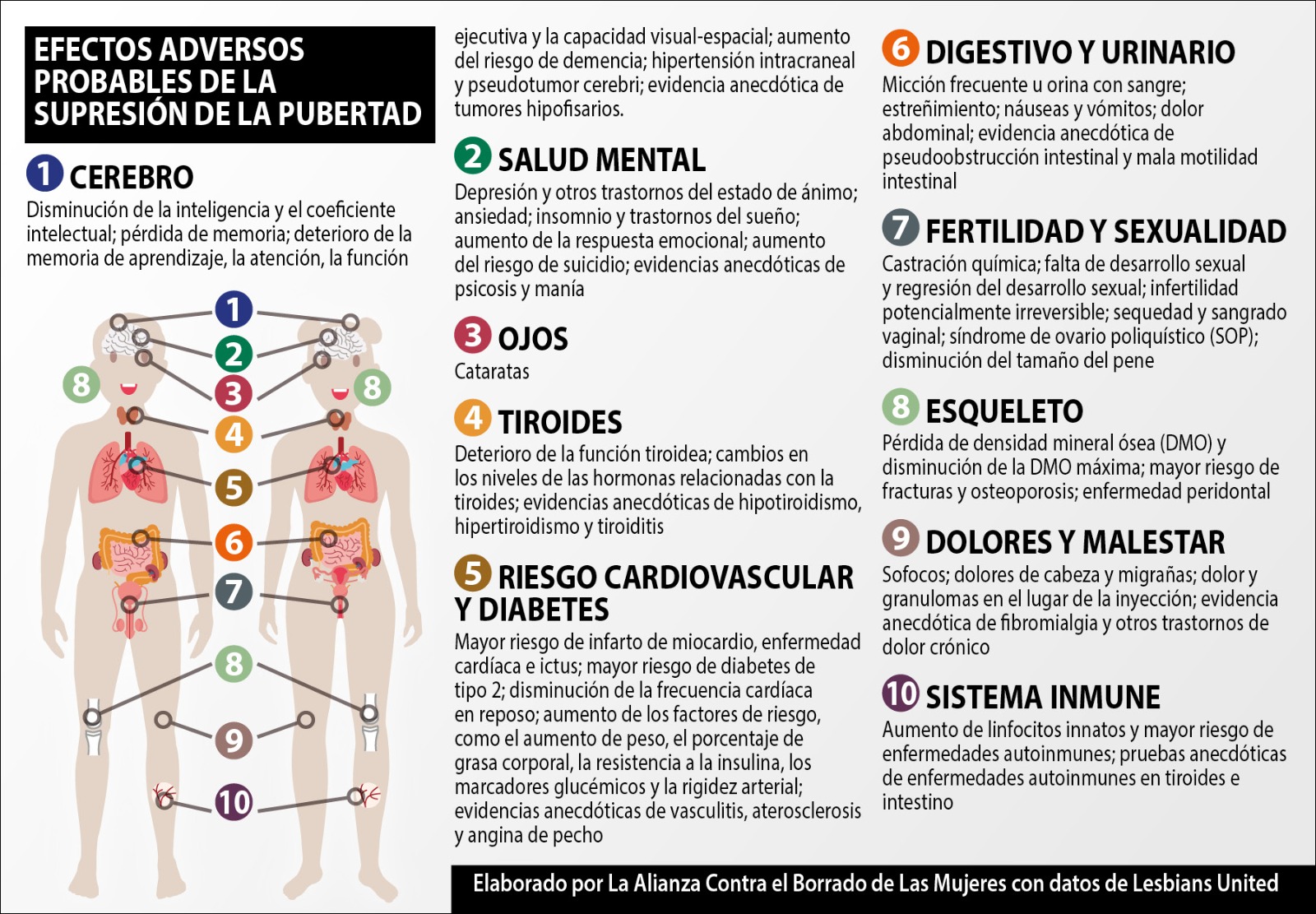 Llegados a este punto, o dejo una infografía resumiendo los posibles efectos secundarios de medicar con bloqueadores a jóvenes que son el objetivo de estas políticas.