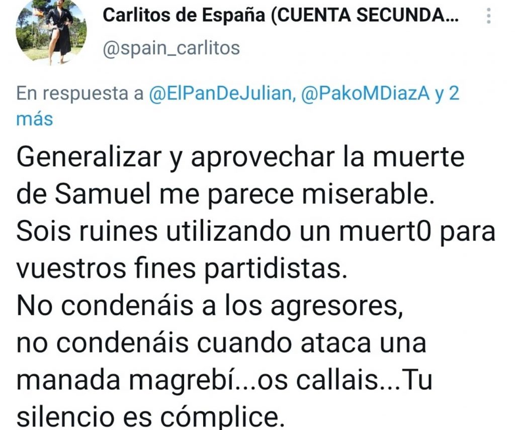 El periodista Julián Yanes sacó un artículo en La Provincia ”La homofobia que mató a Samuel Luiz casi me mata a mí”, el periodista relataba la agresión homófoba que vivió en 2016, según él. Si tan verídica era su historia porqué no supo hablar de las manadas magrebiés y porqué se suma al silencio al conocer que los asesinos no eran españoles…