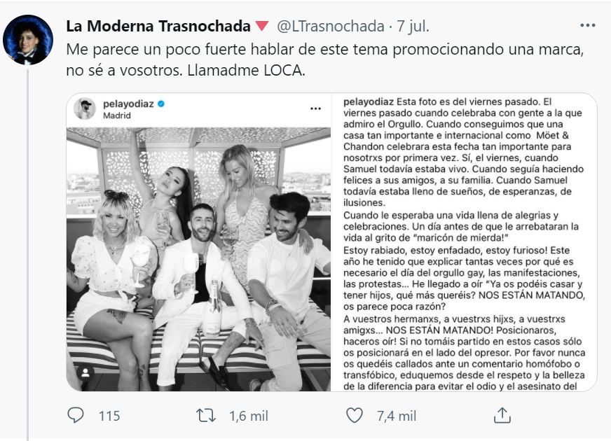 El estilista asturiano Pelayo Díaz mandaba un mensaje en contra de la LGTIFobia acompañado de una clara publicidad hacia una popular marca de cava..¿era el momento? Hasta los suyos del triángulo rojo le saltaron encima..