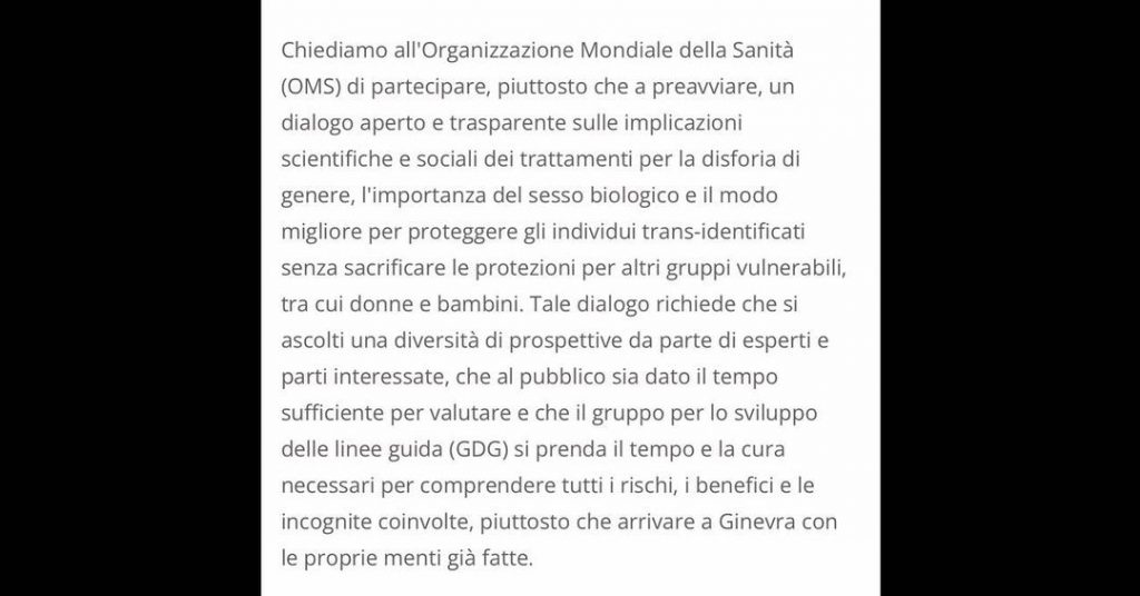Un grupo de firmantes expresa firmes oposición al proceso de creación de nuevas directrices de salud transgénero por parte de la Organización Mundial de la Salud (OMS). Subrayan el fuerte desequilibrio en las personas elegidas a cargo, con más de tres cuartas partes de los miembros activistas transgénero, lo que plantea preocupaciones acerca de la posible falta de objetivo.