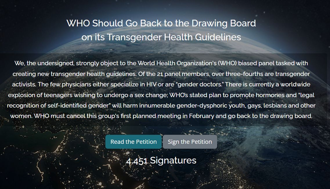 La OMS anunció el 18 de enero de 2024 la creación de pautas de salud para personas transgénero y de género diverso. El panel de 21 miembros, que incluye principalmente activistas transgénero y pocos «médicos de género», está programado que se reúna del 19 al 21 de febrero de 2024 en Ginebra, Suiza