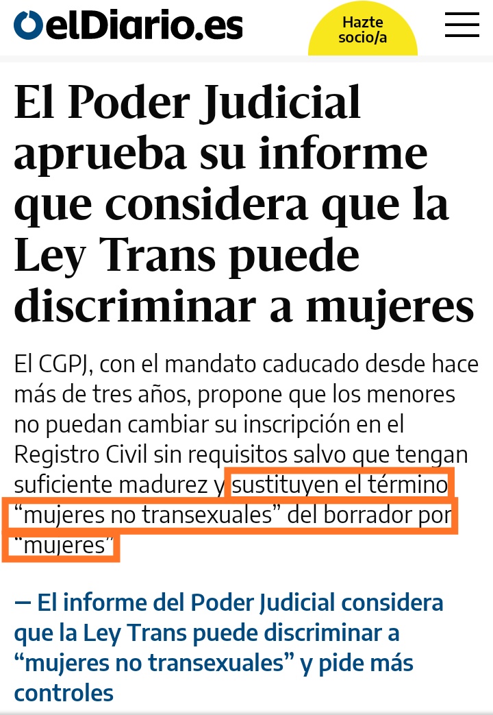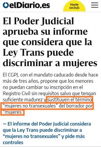 Es conocido que esta ley se lleva un buen varapalo del CGPJ advirtiendo de su anticonstitucionalidad, no solo de alguna parte concreta, sino de varias partes de la misma, aparte de las quejas de las asociaciones feministas y muchas mujeres, con las que sí estoy totalmente de acuerdo, para mí, se trata de borrar a la mujer como «género» que tanto pavonean y van a poner la excusa de que va en ambos sentidos, como suelen denominarlo FTM & MTF, pero realmente solo va a generar conflictos en uno de los lados de la sociedad.