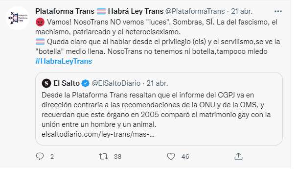 Siguen incluyendo a un grupo de personas que nada tiene que ver con el «lobby LGTB», donde las han incluido con el cuento de la diversidad, se sigue sin entender que los problemas de las personas disforia nada tienen que ver con los del resto de las letras que componen el lobby LGB.