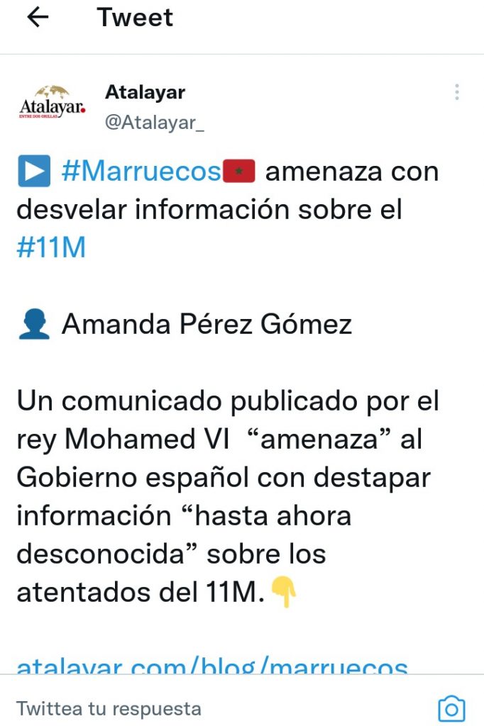 Como consecuencia de la actuación del gobierno español, Marruecos promovió una invasión sin precedentes con miles de inmigrantes que entraron en nuestro país de forma violenta. Una invasión en toda regla que el gobierno español permitió sin mayores problemas. Días después Mohamed VI, a través de varios medios, amenazaba con desvelar información sobre el 11M. Por cierto, dicha amenaza ha sido eliminada de este digital, tan sólo queda este twitt de aquella amenaza: