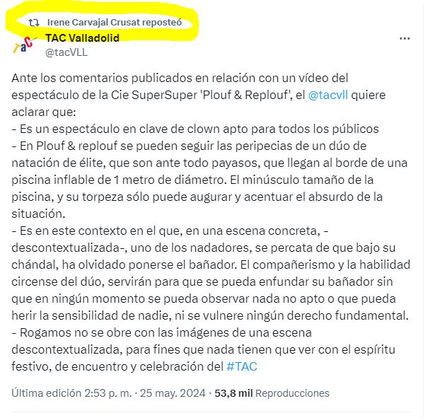 Pero la sorpresa de muchos fue descubrir que la responsable máxima es Irene Carvajal Crusat Concejal de Educación y Cultura quien durante todo el fin de semana del evento guardó silencio en redes sociales y se limitó a retuitear el comunicado de aclaración del espectáculo de la compañía francesa. El silencio otorga, dicen….